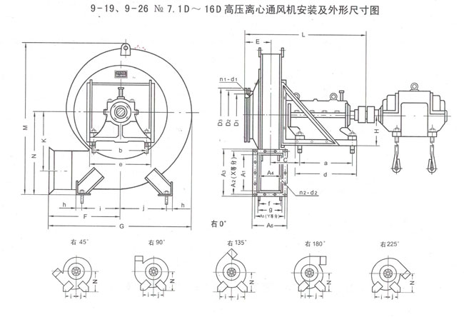 90О、135О、180О、225О<BR>2.說明:本系列風機使用氣體溫度低于150℃,含塵量應小于150mg/ M3.
