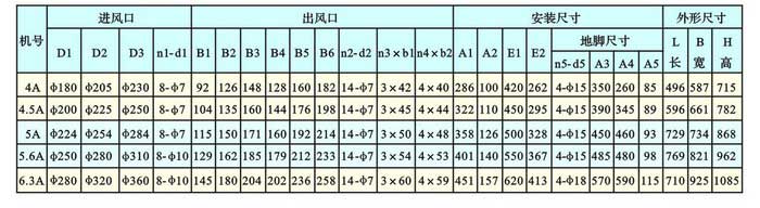 風量(Q):824 ∽ 63307M3/hr全壓(H):366 ∽ 676mmH2O柱機號:4# ∽ 16#傳動方式:A型:電動機與